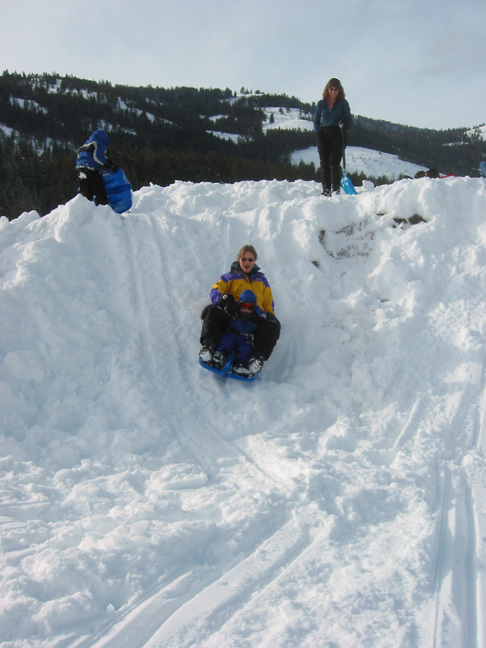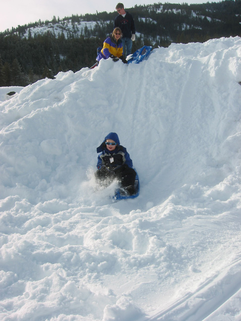 Maren and Gavin sledding down a small, but steep hill. Bryden is on top waiting his turn.