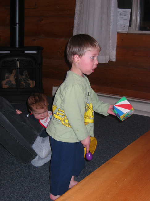 Gavin all bundled up for a walk at sunset ouside of our cabin.