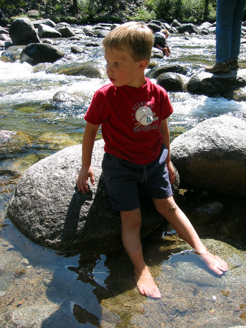 Bryden sitting on a rock he waded out to in the Icicle River (yes, the water felt as cold as the name implied!)