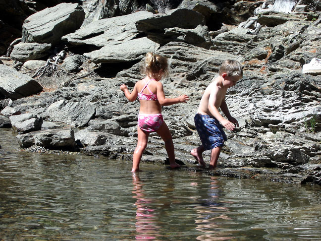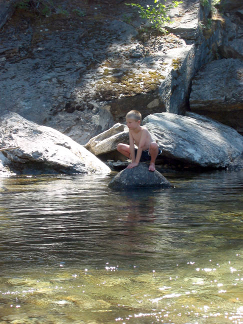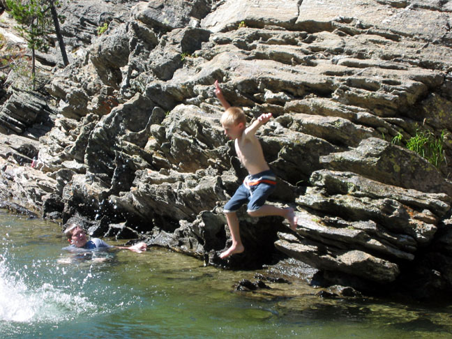 A three foot high ledge provided a great opportunity for jumping into the swimming hole! Bryden's doing an eagle impression now!