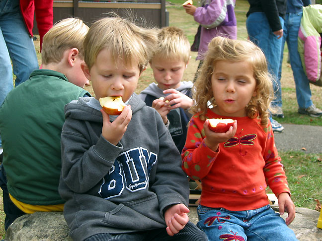 Gavin and Phoebe sharing an apple at Camp Seabeck, with Bryden behind them