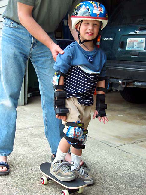 Gavin was really excited about getting a skateboard. Here is is with all his pads on - wrist, elbow and knees.