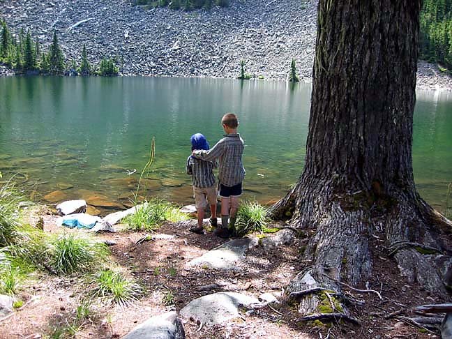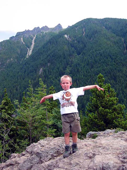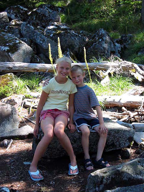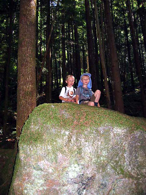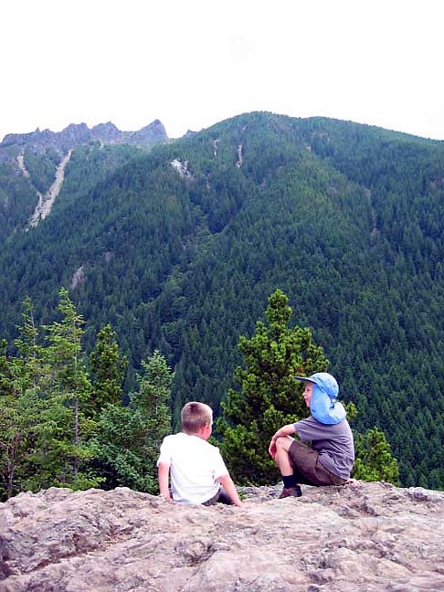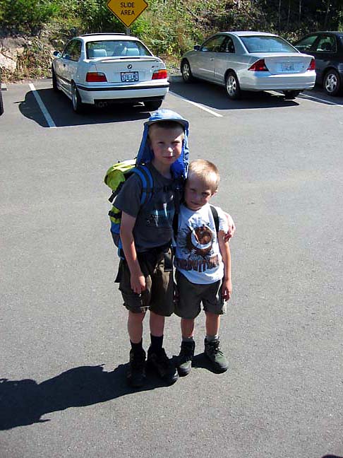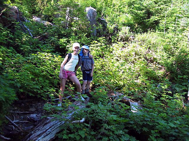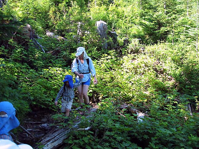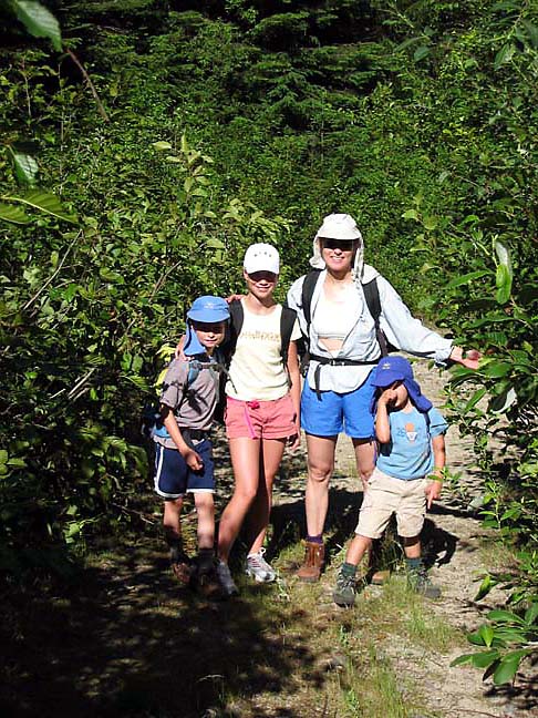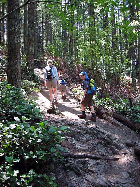 Maren, Gavin and Bryden hiking up a steep section of trail