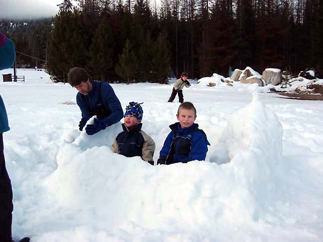 Dad helps out with snow fort building