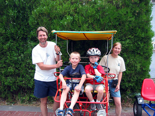 Matt and Maren ready to take Gavin adn Ian out for a pedal car ride