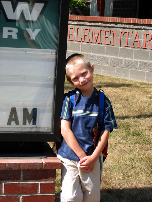 Gavin in front of his new school