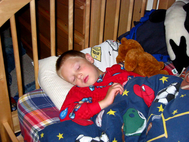 Gavin sound asleep with Listening Bear