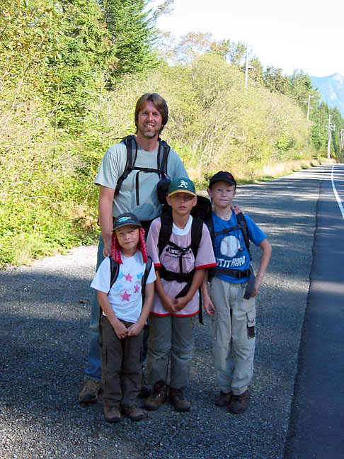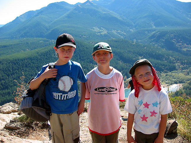 Bryden, Grady and Gavin ready to head down, with Rattlesnake Lake behind them