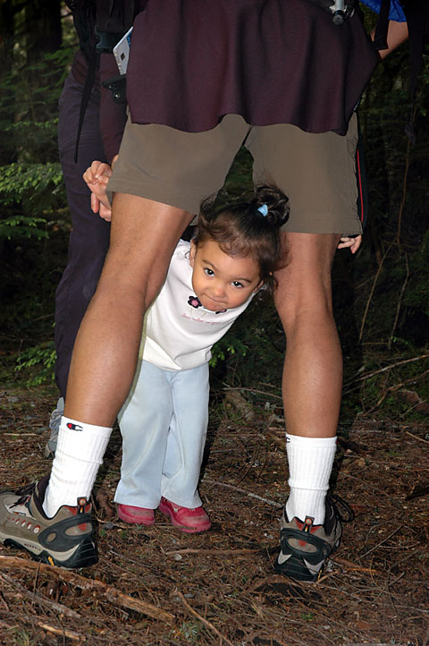 Asia playing peek-a-boo between Ted's legs on the way to the falls