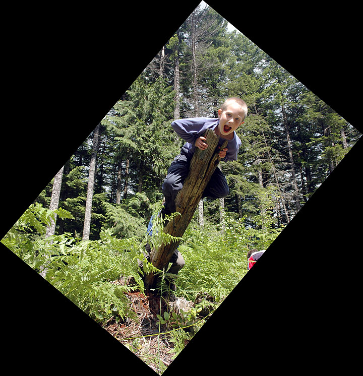 Gavin climbing along an almost fallen over log