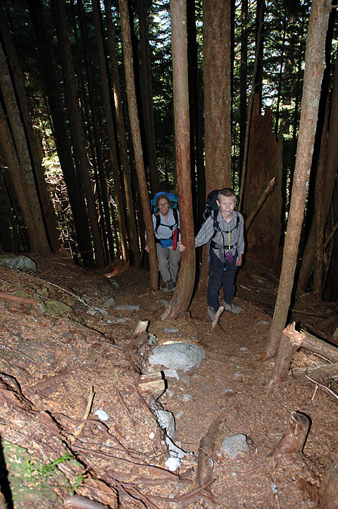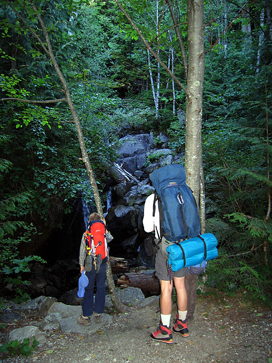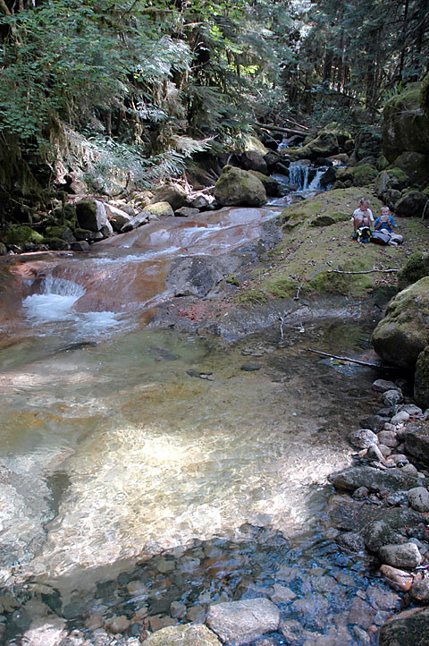 The way goes up through steep, dark forest alongside pretty Mason Creek