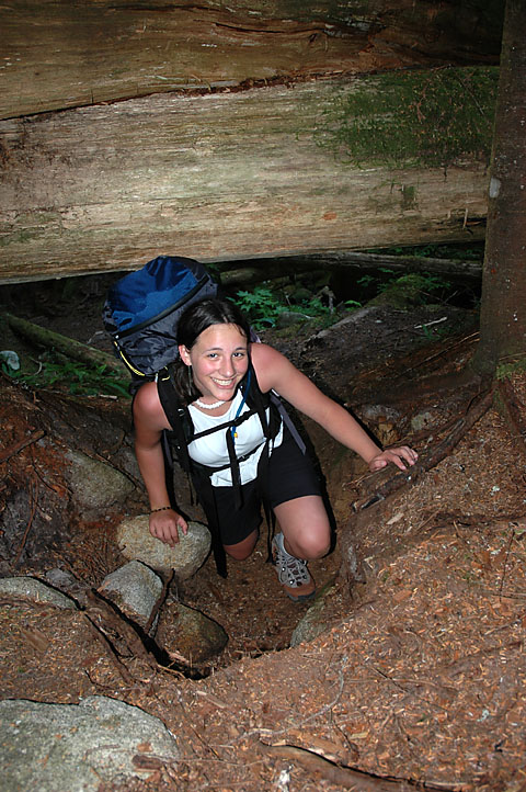 There are fallen logs to go under - Bryden is able to just duck a little...