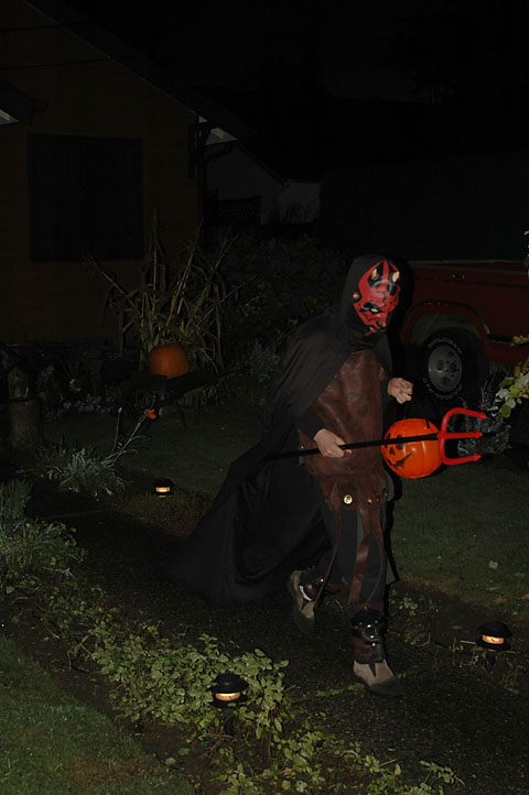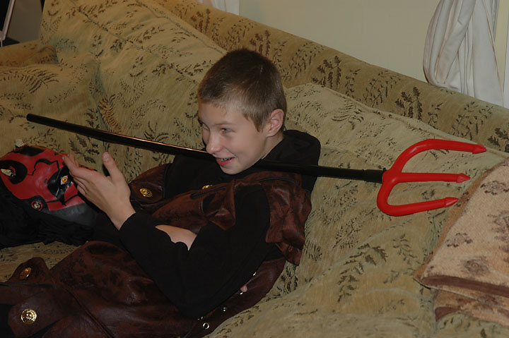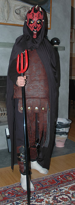 Bryden started out wanting to be Hades, then found some cool Spartan armor, and then wanted to revive his Darth Maul mask and cloak from last year. Put them all together and you have... Demon Child!
