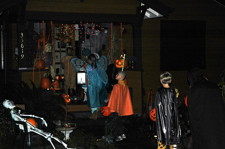 Here's everyone out getting goodies from one of the excellently decorated homes