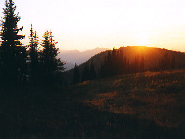 As you climb, you have the opportunity to look south into the North Cascades - Mt. Redoubt crowns the views from here, standing high above anything else south of Mt. Outram. The last running water we came across was around 5900', where the trail crosses a pretty little stream. We stopped here and filled our water bottles, not sure of the water supply higher up. We broke out of the trees around 6000', and could see where the old route headed steeply up the ridge we were on - thankfully, the new regrade took a sidehill switchback here, going through flower meadows (sadly, past their prime this year) and huckleberries galore. Around 6200' we finally found some flat terrain for setting up our tent - there's a small tarn here that still had plenty of water in it, which could have saved us a few pounds of water on the previous 700', had we known for sure it wouldn't be dry. Sunset this day was just after 8:00, and moonset was at 9:30. With no clouds in the sky, the stars were spectacular by the time the sunset glow had disappeared from the mountains.