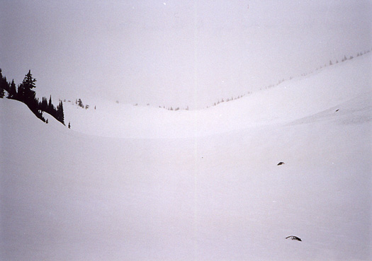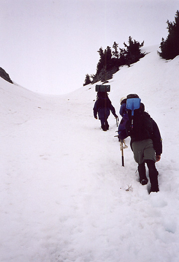 If the cloud cover had been a little higher, we would have been able to see our objective from here, but as it was we had to wait until the descent to see where we had been, instead of being able to look up and see where we were going. We trudged towards the west end of the valley formed by Snow Lake, and headed up the steep gully, still completely snow filled. Avalanche debris, rock and dirt dustings, and the occasional large piece of tree in the snow warned us of the gravitational well we were in, but also showed us that at least some of the sliding activity had already taken place. The snow was quite firm going up the gully, and soon we broke out into the pretty little bowl above, with our limited visibility allowing us to almost see across it. Continuing up and to our left we were soon at the base of the second gully, and climbing towards its top. The snow here was a little less consolidated, but we didn't kick anything off or start any sloughs on our way up. Once at the top of this gully, we were no longer protected from the winds blowing up from the south, and the weather turned decidedly more nippy. Zipping jackets, and disappearing into hoods to protect our faces from the wind and the blowing snow pellets, we headed up the final slope to the ridge line that leads to the summit rocks. We crossed over to the east side of the ridge, and walked the remaining few hundred yards to the base of the summit pyramid, only really being able to see the rocks when we were within 100 feet or so of them. |