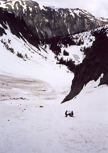 With no sign of a break in the weather, and with the wind still gusting strongly enough to knock you a bit off balance now and then, we eschewed the long summit hang, and started rapping back down to our packs. After getting everyone back on the snow, we helped Lori lighten her load a bit by finishing off the fabulous brownies she brought along for treats. Thus fortified, we repacked all the technical gear, and started retracing our steps, now with a quarter to a half inch of new snow over top of them, back to the top of the first snow gully. Aggie was determined to save the soles of his feet as much as possible and plopped down into the snow starting a nice glissade chute. Most of the others followed his lead, while I opted to plunge step since the climbing pants I was wearing didn't seem to me to have enough material to provide an adequate pad to keep my buns from freezing! The temperature had risen enough during the day that numerous small sloughs were set off by the glissaders, and I descended accompanied by the serpentine hiss of loose snow working its way downhill with me. We rolled along through the alpine bowl above the last snow chute, and Prash put in the next glissade trough, this time kicking up a fairly sizable slough in front of him. I again opted to plunge step, and again was accompanied by the hissing of hundreds of snakes as more and more snow released. Once we were all down and out of the snow gully we stopped to remove some layers of clothing for the final stroll back to the cars, and were rewarded with some peek-a-boo views of the summit we'd been on less than an hour before. The cloud level seemed to be hovering right at the base of the rock pyramid as we could see it from Snow Lake, but we tried taking some pictures of the misty summit anyway.